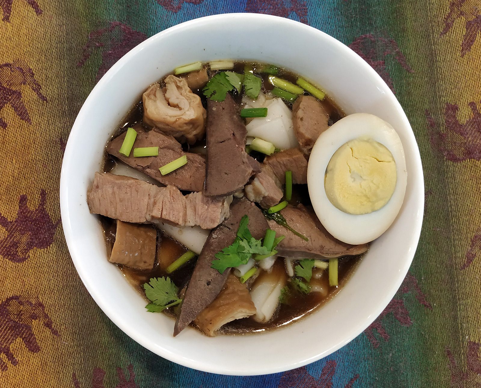 Thai rolled noodles in five spices soup, Guay Jab, is a flavorful and rich tasting soup with a mix of different pork pieces, rolled rice noodles and egg.